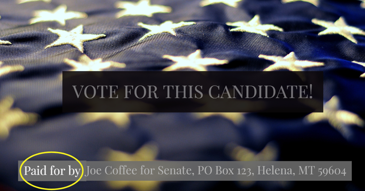 Any candidate or committee's billboard, Facebook ad, yard sign, mailer, google ad, radio ad, keychain, etc., etc., must attribute who paid for the 'communication.' You can see this on the "Paid for by" information. All election and electioneering communications are legally required to include attribution ("Paid for by" information) that identifies the entity that paid for the communication (See Mont. Code Ann. § 13-35-225 for legal details). The attribution must clearly identify the name and mailing address of the entity that paid for the communication. Committee attribution must also include the name of the Treasurer. **In partisan elections, candidates must also state their party affiliation or include the party symbol.**